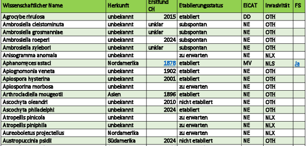 In dieser Unterrubrik finden Sie eine Auflistung aller bekannten Neomyceten der Schweiz (aktuell 365 Arten) sowie einiger in naher Zukunft zu erwartenden Arten (aktuell 26 Arten). Die Liste umfasst somit insgesamt 391 Arten, wovon 53 Arten nach heutigem Kenntnisstand als invasiv gelten und 2 Arten als potentiell invasiv. Grundlage für diese Unterrubrik ist die Neomycetenliste aus dem WSL-Bericht «Neomyceten in der Schweiz» von Beenken und Senn-Irlet, welche seit 2019 im Auftrag des BAFU (Bundesamt für Umwelt) laufend aktualisiert wird. Eine solche Liste ist niemals abschliessend, da laufend wieder neue Arten auftauchen oder sich auch die Invasivität von bereits etablierten Arten im Laufe der Zeit ändern kann.